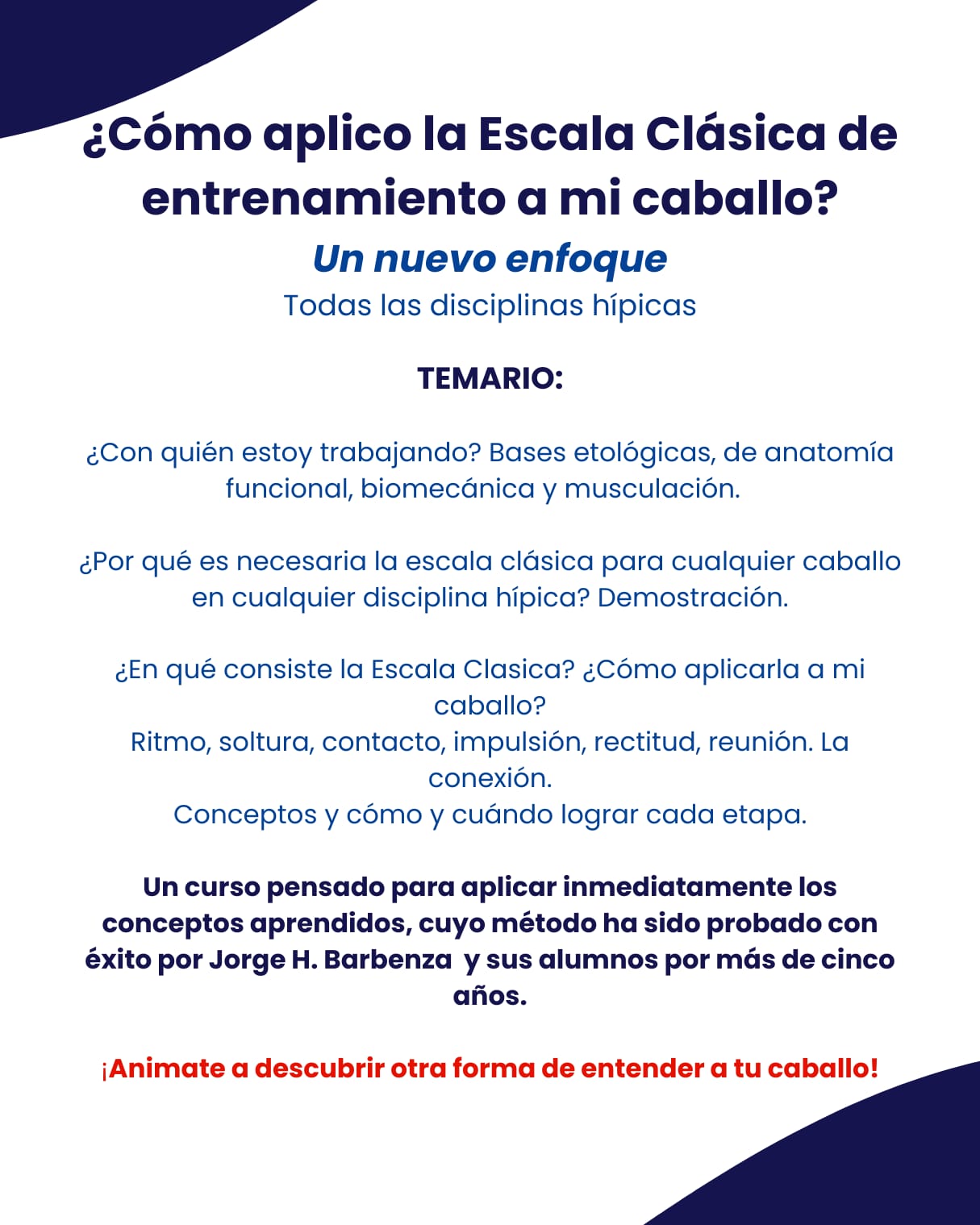 "El curso es sobre la escala clásica de entrenamiento aplicada. Es decir, es un enfoque con todas sus etapas, para que la persona que haga el curso pueda al día siguiente ir y aplicar las cosas con su caballo, y a su vez también con inclusión de herramientas que nos dan la biomecánica, la musculación y la anatomía funcional, que son cuestiones más modernas que cuando surgió la escala clásica", detalló.