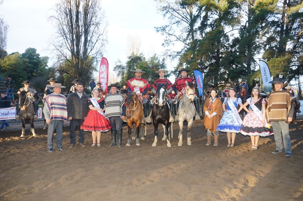 3.- El Yugo de Colina, Fernando Barros en Santa Bárbara de los Guaicos Intocable, Mauricio Muñoz en Casas de Quiñipeumo Farrera y Erik Muñoz en El Yugo de Colina Belicosa con 1'22" (45" y 37") y 6 animales apartados.