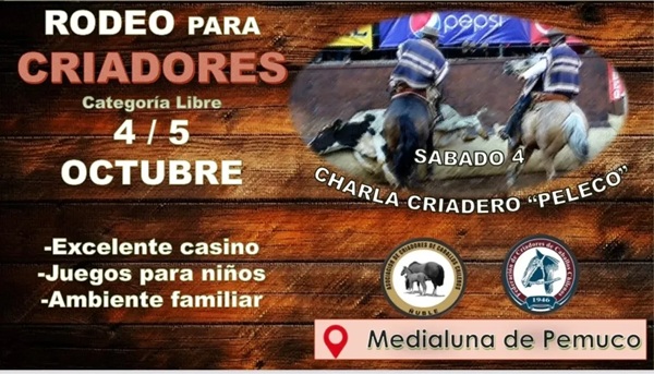 El sábado 4 y domingo 5 habrá rodeo para criadores en Pemuco, para el cual se está armando el programa, pero que contará con presencia del Criadero Peleco, con los jinetes Campeones de Chile, Gustavo Valdebenito y Felipe Garcés.