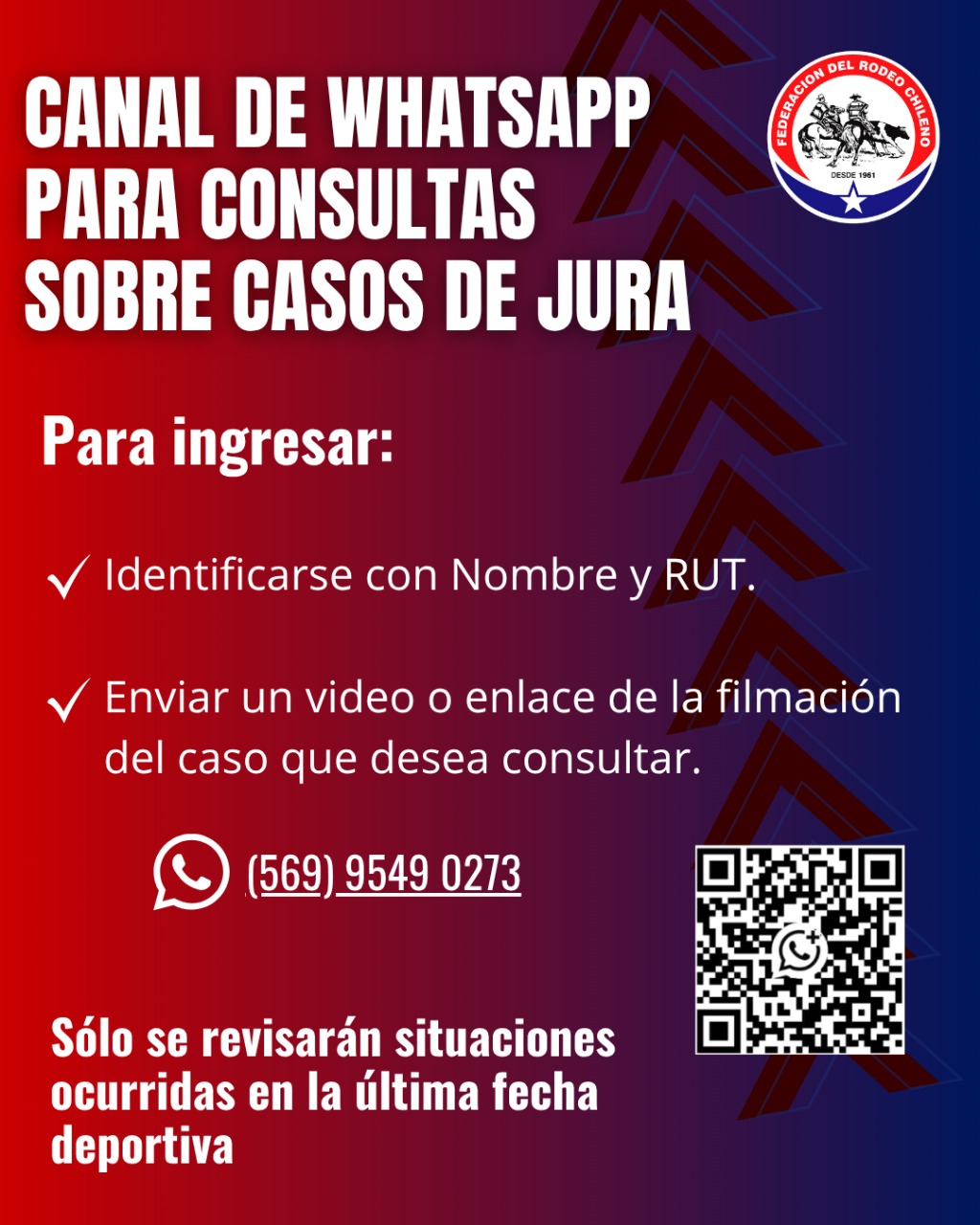 En esta línea, hemos puesto en marcha un canal de WhatsApp para aclarar y realizar consultas sobre casos de jura. Esta herramienta se suma al canal existente en la página https://ferochi.cl/formulario-de-consultas-deportivas/.