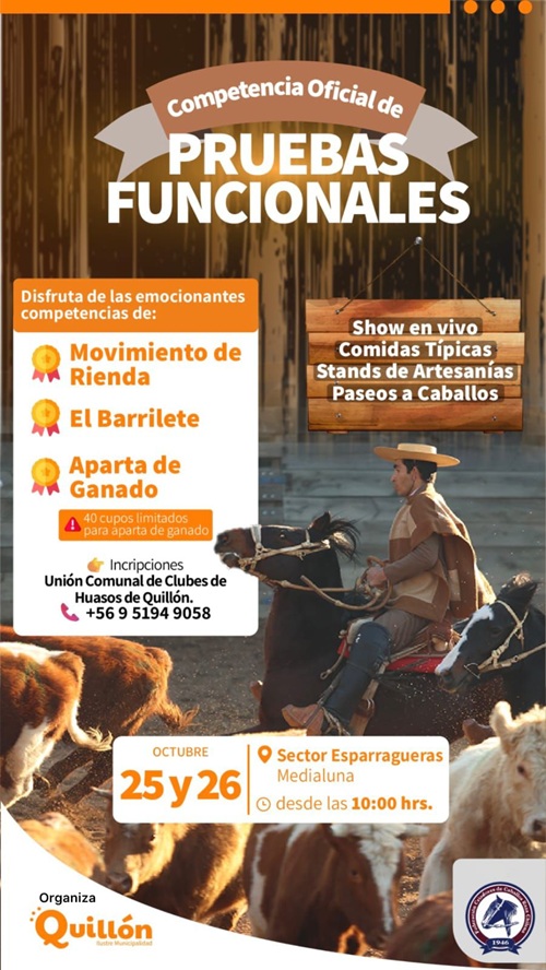 La Ilustre Municipalidad de Quillón y la Unión Comunal de Clubes de Huasos de la comuna unieron esfuerzos para organizar una fecha oficial de Pruebas Funcionales de la Federación Criadores de Caballos Raza Chilena, que se va a realizar este sábado 25 y domingo 26 de octubre en la medialuna del sector Esparragueras.