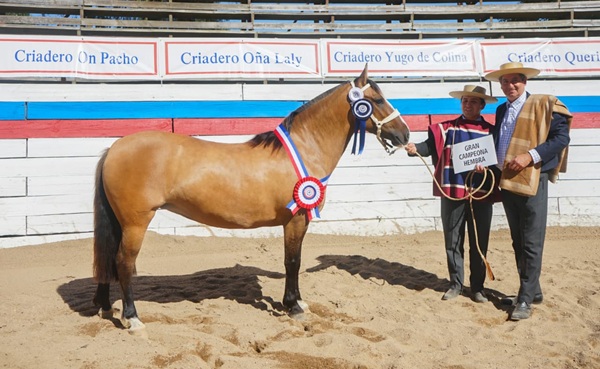 Campeona Yegua Mayor: El Yugo de Colina Guerrera. N° de Inscripción: 284656. Fecha de Nacimiento: 20-10-2018. Padre: Santa Isabel Bandolero. Madre: El Yugo de Colina Esperanza. Criador y Expositor: Fernando Barros Edwards.