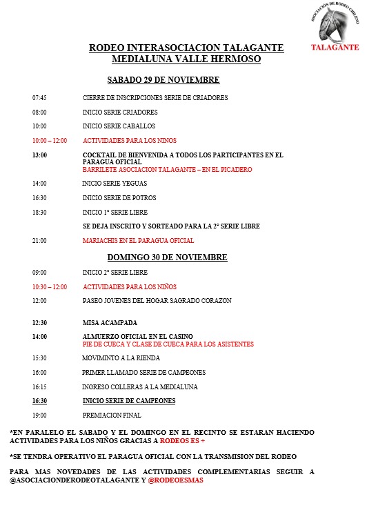 La Asociación Talagante y la fundación Rodeo Es Más prepararon para este fin de semana un Rodeo Interasociaciones Especial que contará con hartas actividades para la familia y la comunidad en la Medialuna de Valle Hermoso.