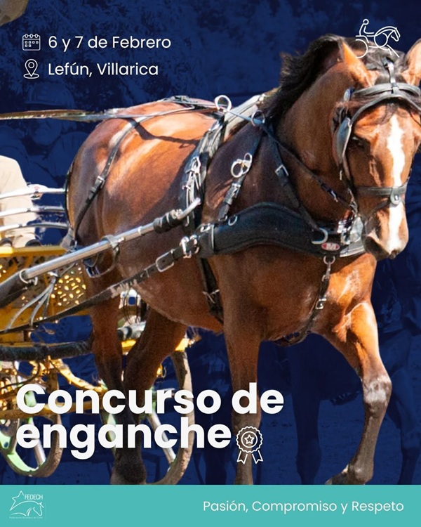 "La Asociación de Enganche de Chile tiene un circuito de concursos de Enganche Ecuestre a lo largo del país durante todo el año y este año en Villarrica se van a hacer dos concursos. Uno lo organiza la Cochera Lefún, en un lugar muy bonito, entre Villarrica y Pucón, que se va a hacer este fin de semana; y el otro lo organiza la Cochera Las Peñas, el 11 y 12 de febrero. Por lo tanto, descansan dos días los caballos y cocheros, y miércoles y jueves lo hacemos nosotros. Eso da la facilidad para todos con sus camiones, coches y caballos, ya que, en una semana, hacemos los dos concursos", señaló a CaballoyRodeo.
