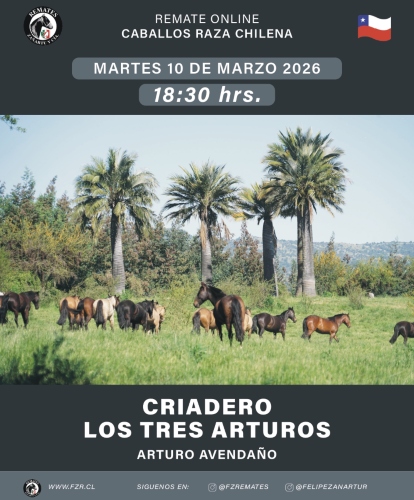El Criadero Los Tres Arturos, propiedad de Arturo Avendaño, tiene este martes 10 de marzo desde las 18:30 horas un atractivo remate de Caballos Raza Chilena.