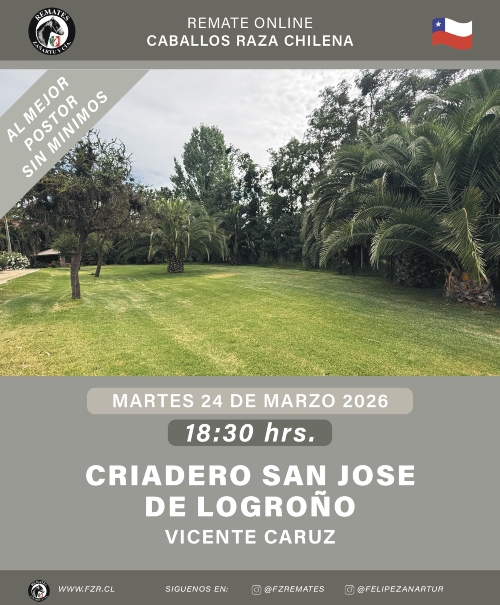 El Criadero San José de Logroño, propiedad de don Vicente Caruz, tiene este martes 24 de marzo desde las 18:30 horas un interesante remate de Caballos Raza Chilena.