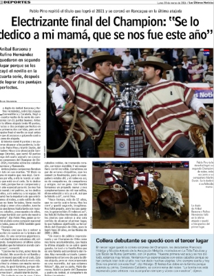 Las Últimas Noticias también le dedicó un amplio reportaje a la gran final: "Electrizante final del Champion", destacando lo hecho por Pablo Pino, quien sumó su segundo título en Rancagua: "Se lo dedico a mi mamá, que se nos fue este año", dijo el jinete.