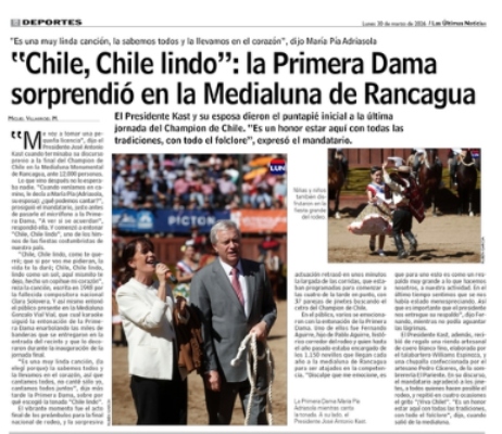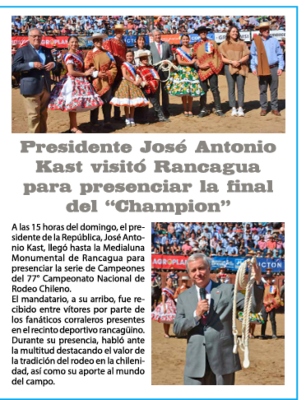"'Y que viva Chile', gritó varias veces el Presidente José Antonio Kast desde la Medialuna mientras se desarrollaba el 77° Campeonato Nacional de Rodeo", dice la nota.