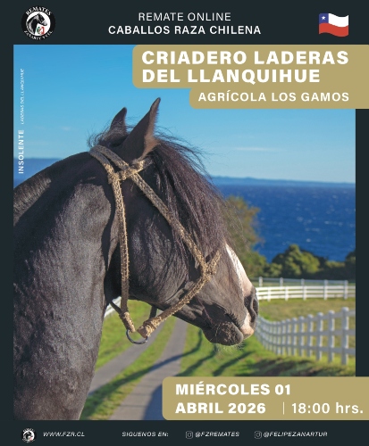 El Criadero Laderas del Llanquihue, propiedad de Agrícola Los Gamos, tiene este miércoles 1 de abril desde las 18:00 horas un atractivo remate de Caballos Raza Chilena con un catálogo de seleccionados productos.