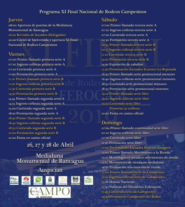 Respecto del rodeo mismo, señaló: "Llegarán 150 colleras, incluido los Campeones del año pasado. El día jueves se abrirán las puertas a las 08:00 horas, para que vayan ingresando nuestros participantes. A las 16:00 del mismo jueves cada uno de los participantes se tiene que presentar con los delegados, para hacer revisión de bocados. Y posterior a eso, a las 20:00, está programado hacer un cóctel de bienvenida para todas las colleras que participan. Allí les entregaremos un reconocimiento a cada collera que llegó a nuestra Final".