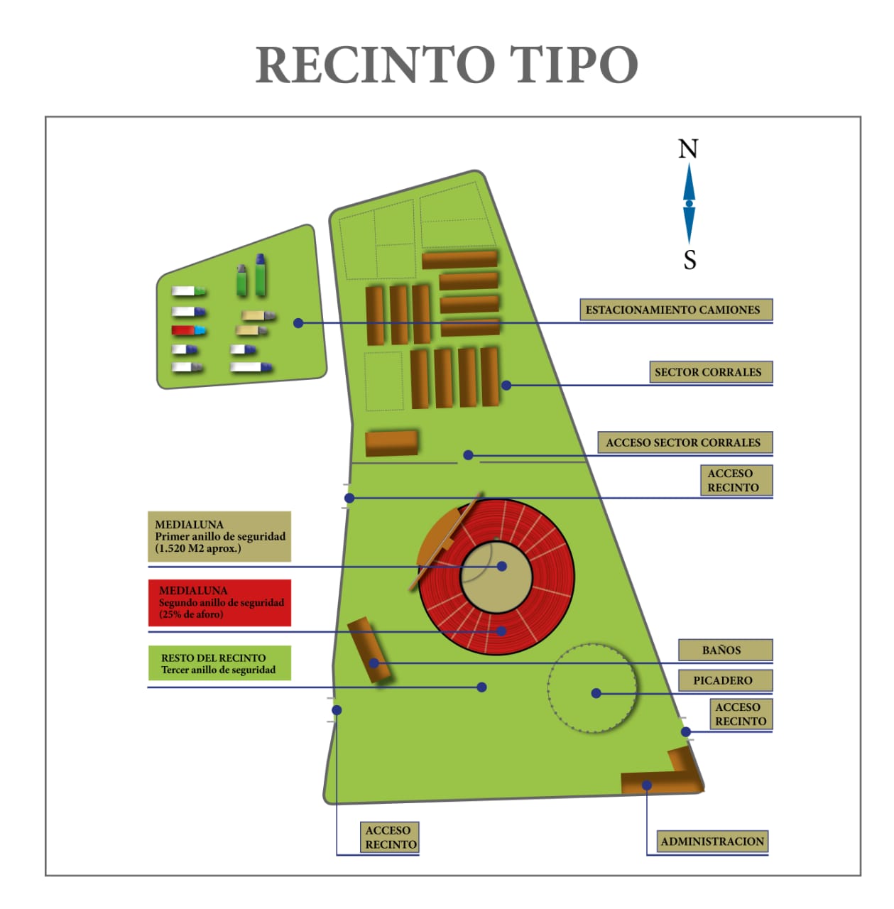 - Este debe contar con el espacio suficiente para el área de camiones, estacionamientos, picadero, pesebreras, corrales, baños y espacios comunes.