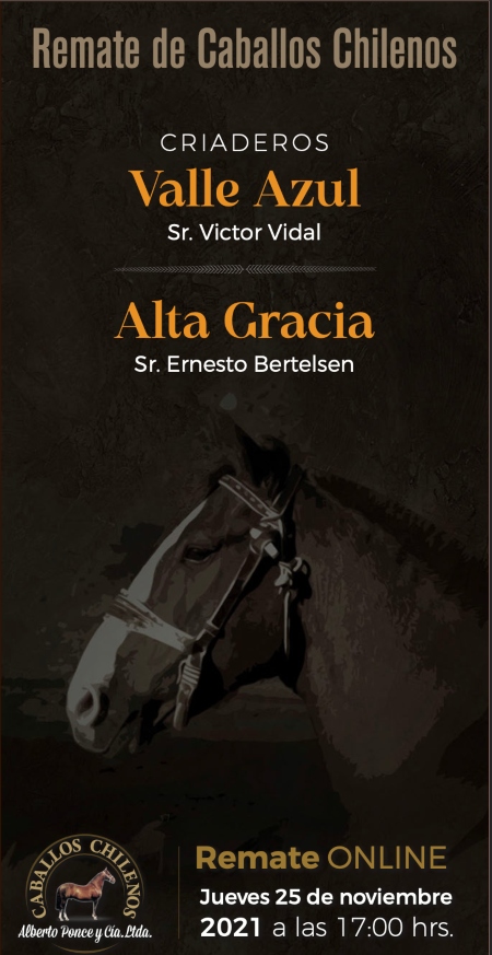 Un atractivo remate de Caballos Chilenos se realizará este jueves 25 de noviembre desde las 17:00 horas, cuando salgan a martillo atractivos ejemplares de los Criaderos Alta Gracia, propiedad de Ernesto Bertelsen, y Valle Azul, de Víctor Vidal.