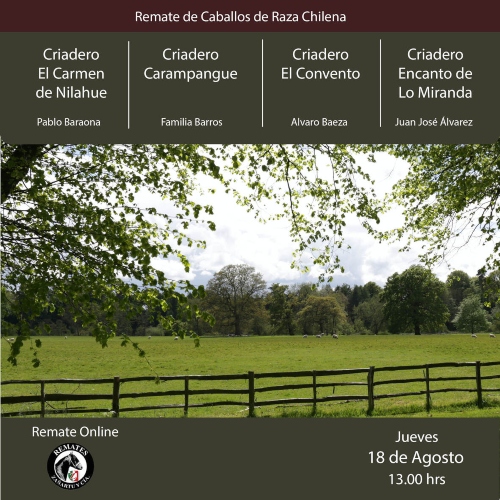 Un atractivo remate de Caballos de Raza Chilena se dará este jueves desde las 13:00 horas cuando salgan a martillo interesantes ejemplares de los Criaderos El Carmen de Nilahue, de Pablo Baraona; Carampangue, de la familia Barros; El Convento, de Alvaro Baeza; y Encanto de Lo Miranda, de Juan José Álvarez, además de otros vendedores.
