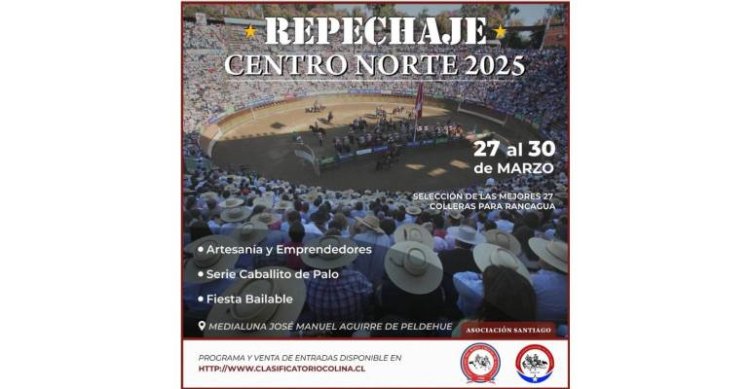 Este 27, 28, 29 y 30 de marzo se disputará el Repechaje Centro-Norte en la Medialuna "José Manuel 'Coteco' Aguirre" de Colina, quinta estación rumbo al 76° Campeonato Nacional de Rodeo. El evento corralero es organizado por la Asociación Santiago, presidida por Pablo Campos.
