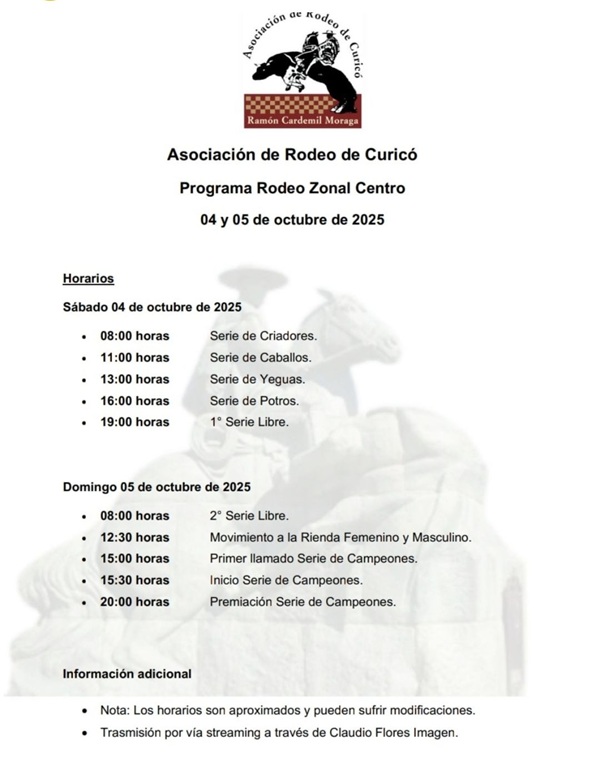 El Zonal Centro 2025 se disputará este sábado 4 y domingo 5 de octubre en la Medialuna de Curicó, organizado por la Asociación de Rodeo de Curicó "Ramón Cardemil Moraga".