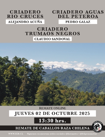 Los Criaderos Río Cruces, propiedad de Alejandro Acuña; Trumaos Negros, de Claudio Sandoval, y Aguas del Peteroa, de Pedro Galaz, tienen este jueves 2 de octubre desde las 13:30 horas un remate de interesantes ejemplares.
