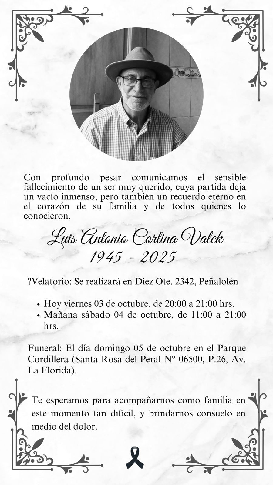 El Directorio de la Federación del Rodeo Chileno entrega sus más sentidas condolencias a la familia de don Luis Cortina Valck (QEPD), quien falleció este viernes a los 71 años.