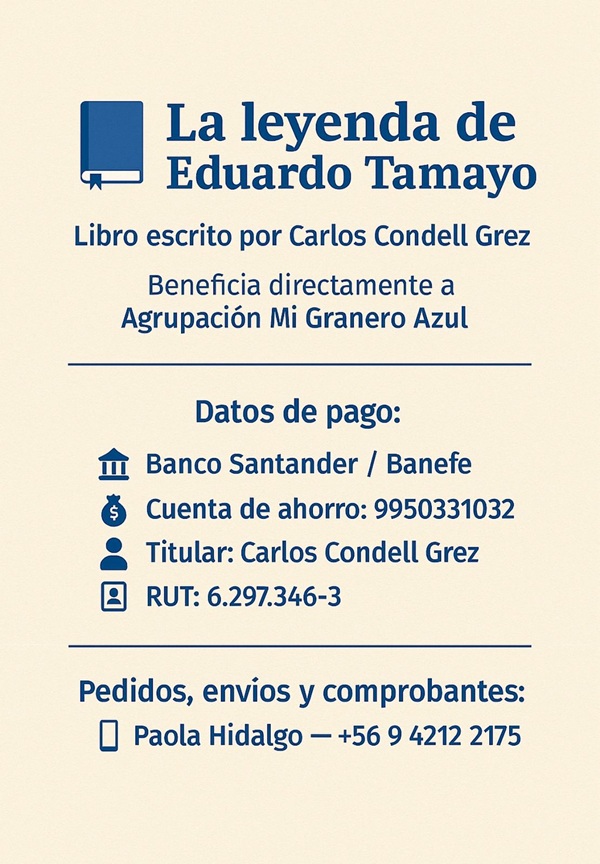 El libro "Eduardo Tamayo, la leyenda", de Carlos Condell Grez, cumple dos importantes objetivos, como son homenajear al siete veces Campeón de Chile de Rodeo, repasando su vida y trayectoria, y beneficiar con su venta a la Agrupación Mi Granero Azul, que ofrece atención personalizada para niños del espectro autista.