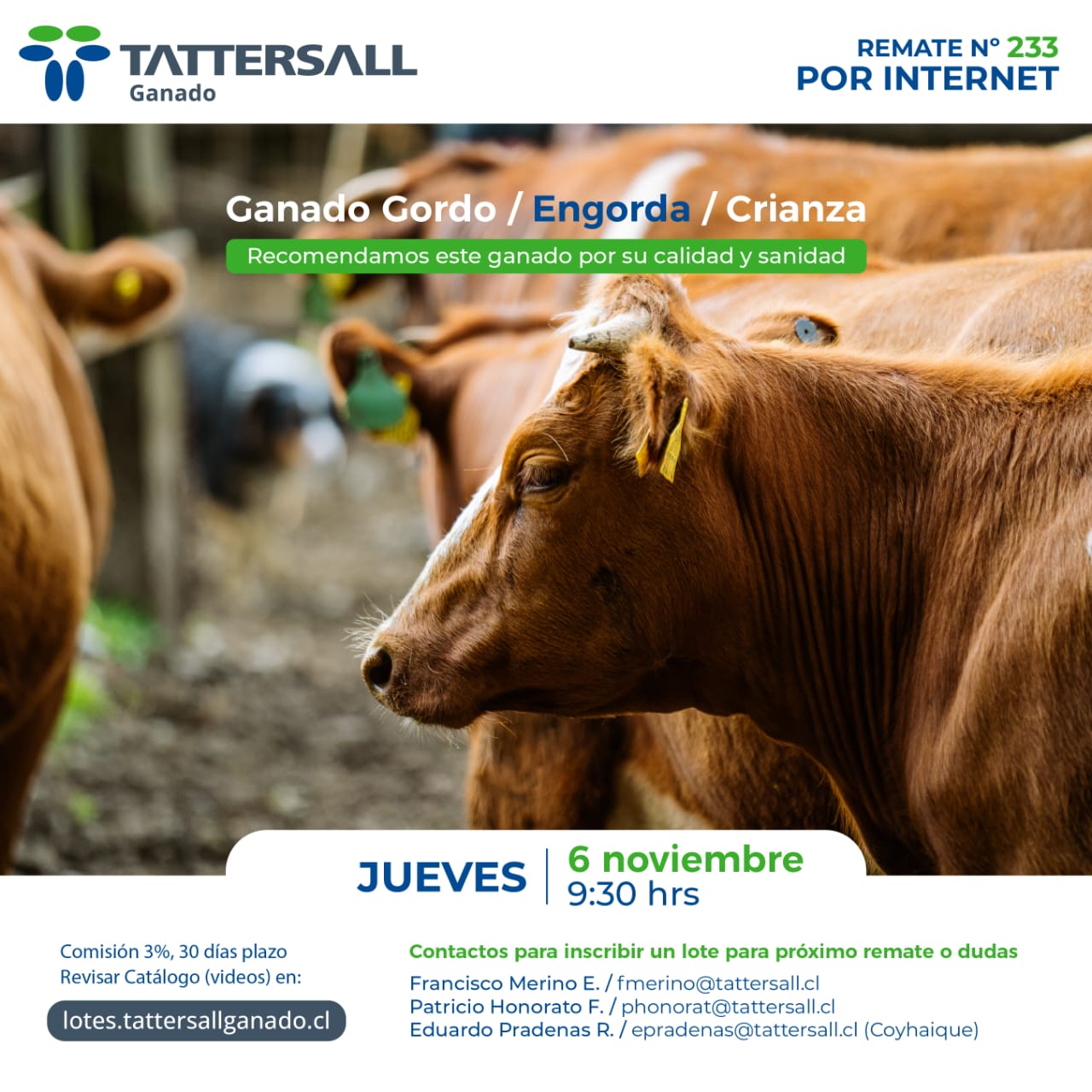 El catálogo completo de los novillos estará disponible en la página web: www.lotes.tattersallganado.cl.