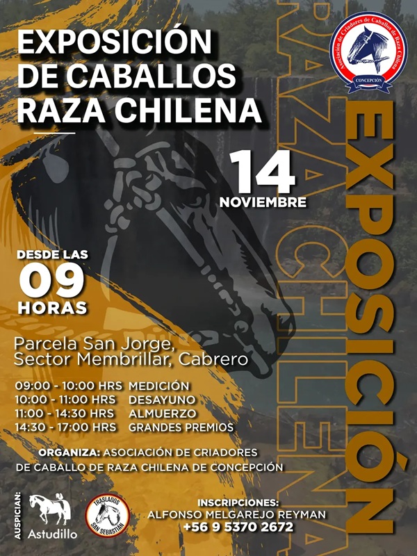 Trabajando y esperando con ansias la fecha de la jura, se encuentran en la Asociación de Criadores de Concepción para su Exposición de Caballos Raza Chilena a efectuarse el viernes 14 de noviembre en el Criadero Doña Gume, ubicado en la Parcela San Jorge, sector Membrillar, en la comuna de Cabrero.
