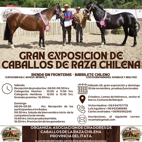 La Asociación de Criadores de Caballos Raza Chilena Provincia del Itata está recibiendo inscripciones para su exposición y fecha de pruebas funcionales, que se realizarán el 29 y 30 de noviembre en el Criadero Lomas de Metrenco, en la comuna de Ránquil.