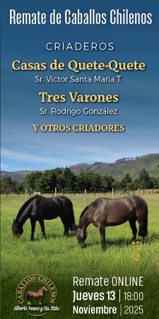 Los Criaderos Casas de Quete-Quete, de Víctor Santa María; Tres Varones, de Rodrigo González, y otros, tienen este jueves 13 de noviembre desde las 18:00 horas un interesante remate de Caballos Raza Chilena.