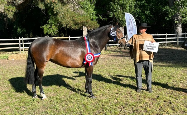Campeona Yegua: Lago de Los Alpes Puyehuina. N° de Inscripción: 316620. Fecha de Nacimiento: 21-09-2022. Padre: Puyehue Puyehue. Madre: Altazor Milagrosa. Criador y Expositor: Ariel Ignacio Díaz González.