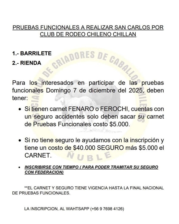 La Asociación de Criadores de Caballos Raza Chilena de Ñuble realizará una nueva fecha de Pruebas Funcionales, en este caso de Barrilete Chileno y Rienda Sin Fronteras, este domingo 7 de diciembre en la Medialuna Monumental de San Carlos, clasificatoria para la Final de Pemuco.