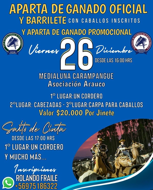 "Estamos con programa completo, nos estamos anclando en la Medialuna de Carampangue, lugar donde lo hemos estado haciendo estos últimos años, que tiene una muy buena infraestructura y corral de aparta. Partiremos el día después de Navidad, tempranito, con la exposición. El viernes 26 tendremos Exposición, Aparta de Ganado y Barrilete", indicó.
