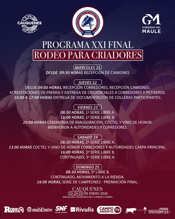 La Asociación de Criadores de Caballos Raza Chilena de Cauquenes, que preside Enrique Ramírez Acevedo, entregó el programa de la XXI Final de Rodeos Para Criadores, que se desarrollará del 23 al 25 de enero de 2026 en la Medialuna de Cauquenes.