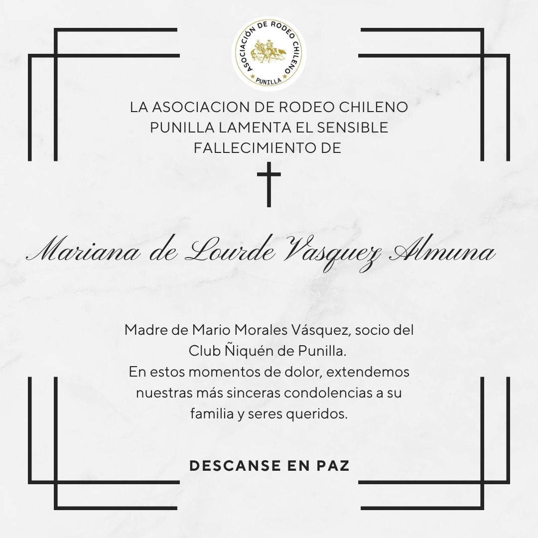 Una triste oticia para el mundo huaso. Falleció Mariana de Lourde Vásquez Almuna (QEPD), madre de Mario Morales Vásquez, socio del Club Ñiquén de Punilla.