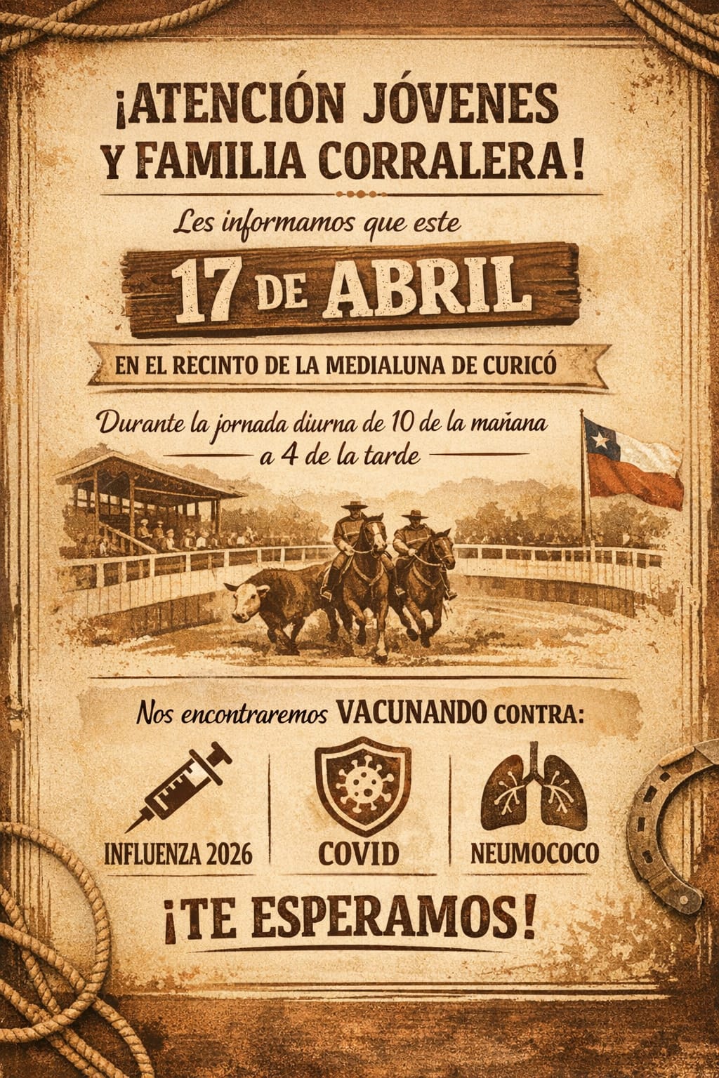 Una importante gestión social realizará la Asociación Aguanegra, la Rama de Rodeo de la Pontificia Universidad Católica y la Municipalidad de Curicó el viernes 17 de abril en la Medialuna Monumental de Curicó, ya que el Campeonato Nacional Universitario se sumará a la campaña de vacunación del Gobierno de Chile, inoculando a la comunidad para prevenir enfermedades como la Influenza, el Covid y Neumococo.