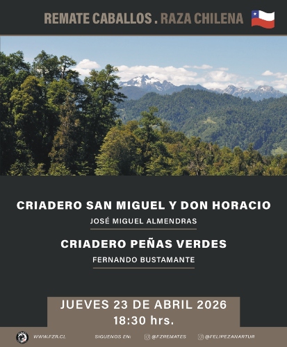 Los Criaderos San Miguel y Don Horacio, de José Miguel Almendras; Peñas Verdes, de Fernando Bustamante; Santa Ana de Pile, de Cristián García; y Curamavida, de Damián Dragona, tienen este jueves 23 de abril desde las 18:30 horas un atractivo remate con caballos de variadas sangres y en diversos estados de trabajo.